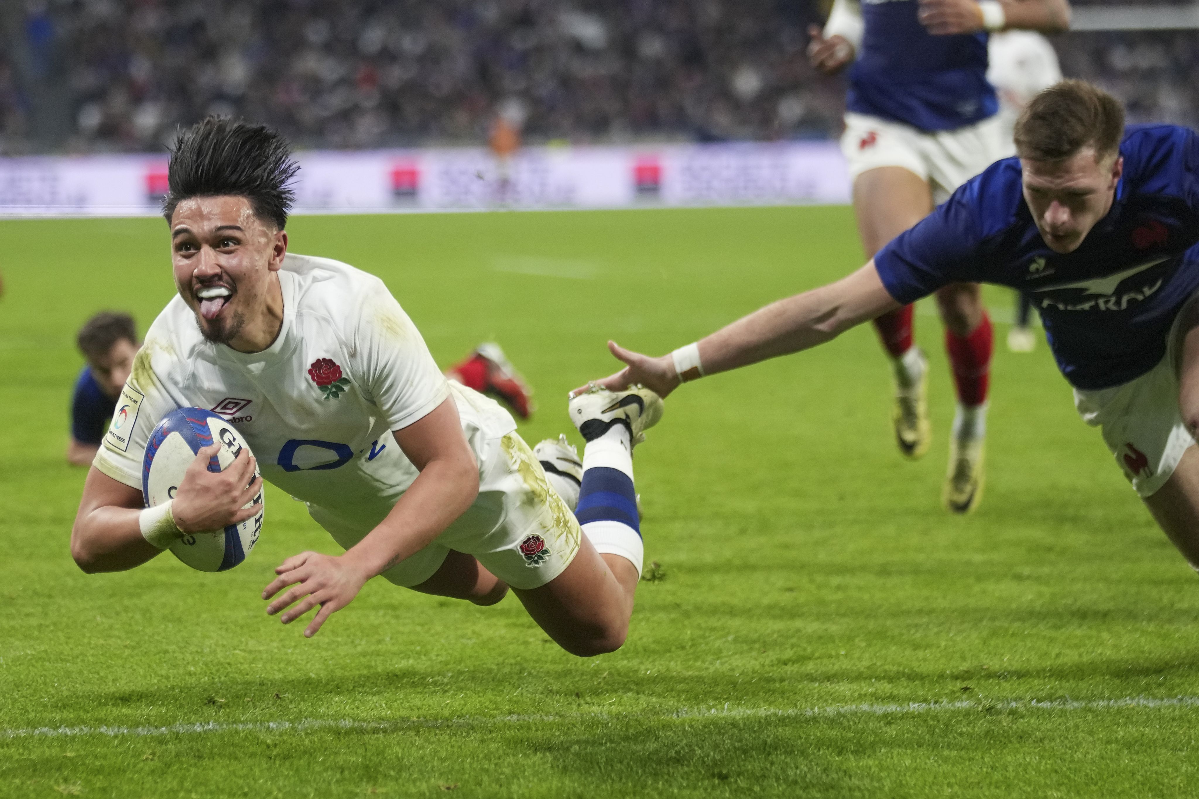 England's Marcus Smith scores a try during the Six Nations rugby match between France and England at Groupama Stadium in Lyon on March 16 (AP Photo/Laurent Cipriani)