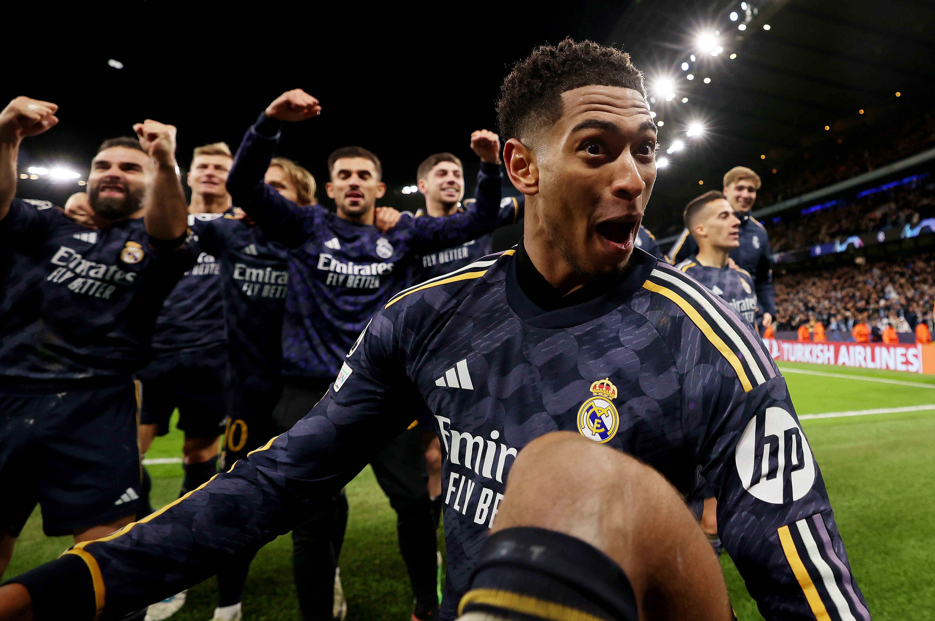 Jude Bellingham of Real Madrid celebrates following the team's victory in the penalty shoot out during the UEFA Champions League quarter-final second leg against Manchester City on April 17. (Photo by Naomi Baker/Getty Images)