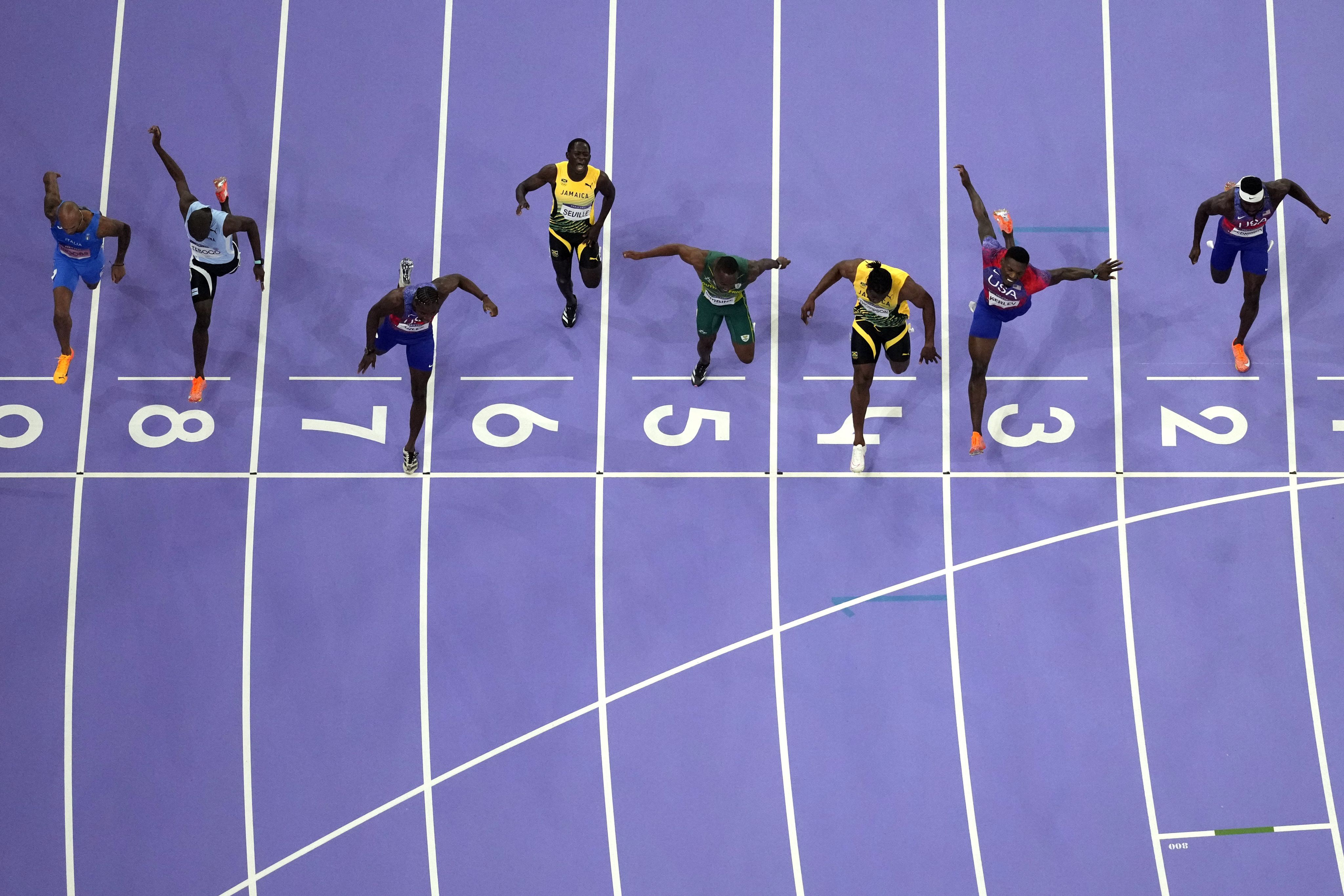 Noah Lyles of the United States (third left) wins the men's 100-metre final by photo finish at the 2024 Paris Olympics on Aug 4. (AP Photo/David J. Phillip)