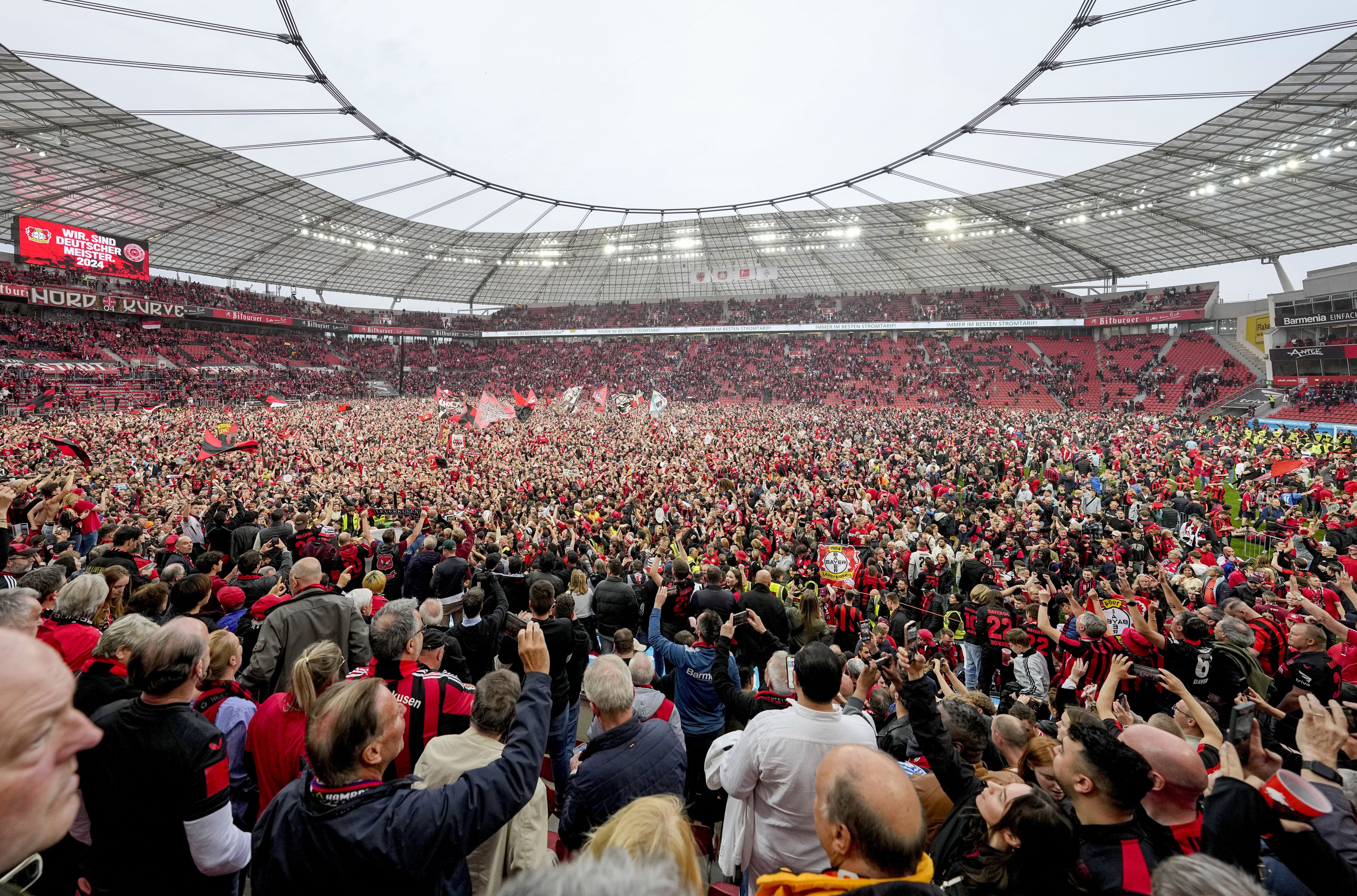 Bayer Leverkusen fans celebrate on the pitch after the club won their first-ever German Bundesliga title with the defeat of Werder Bremen on April 14. (AP Photo/Martin Meissner)