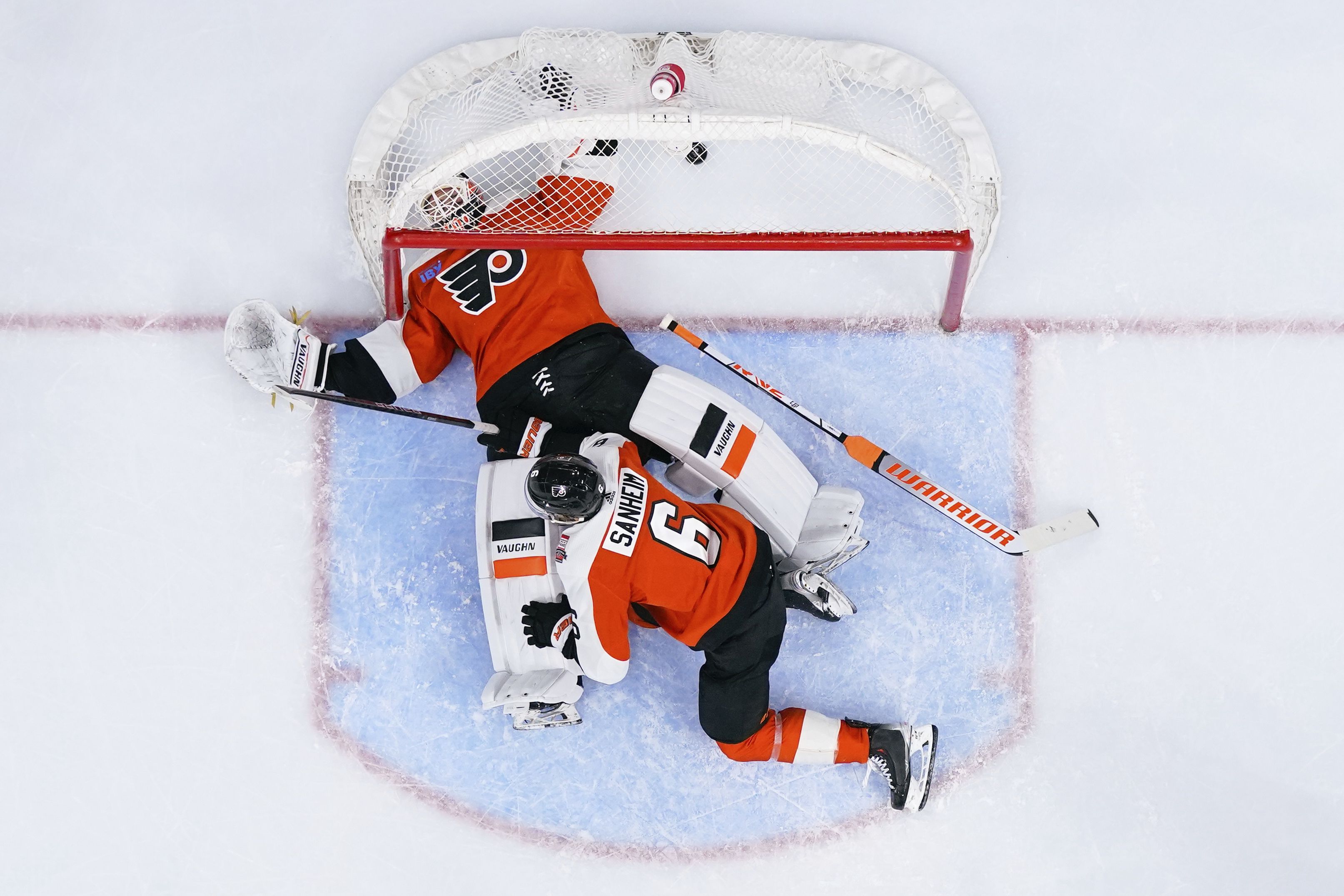 Philadelphia Flyers goaltender Cal Petersen lays on the ice with teammate Travis Sanheim after giving up a goal to Boston Bruins' Charlie Coyle (not pictured) during the third period of an NHL hockey game on Jan 27. (AP Photo/Derik Hamilton)