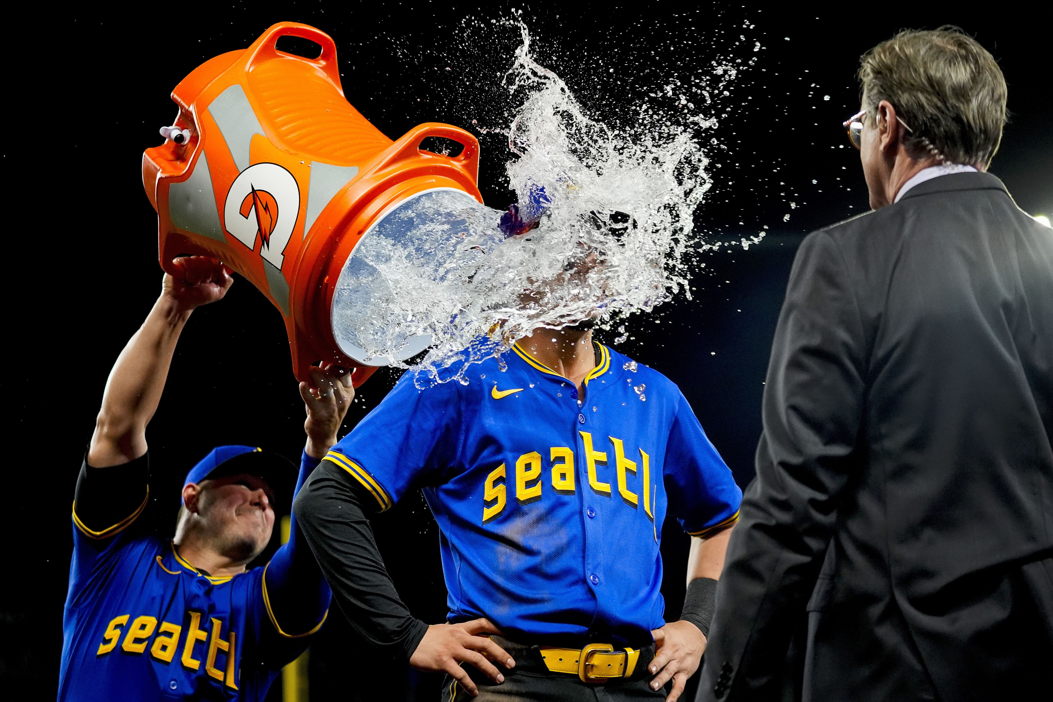 Seattle Mariners' Josh Rojas is doused by teammate Ty France during an interview after the team's win over the Arizona Diamondbacks on April 26. (AP Photo/Lindsey Wasson)