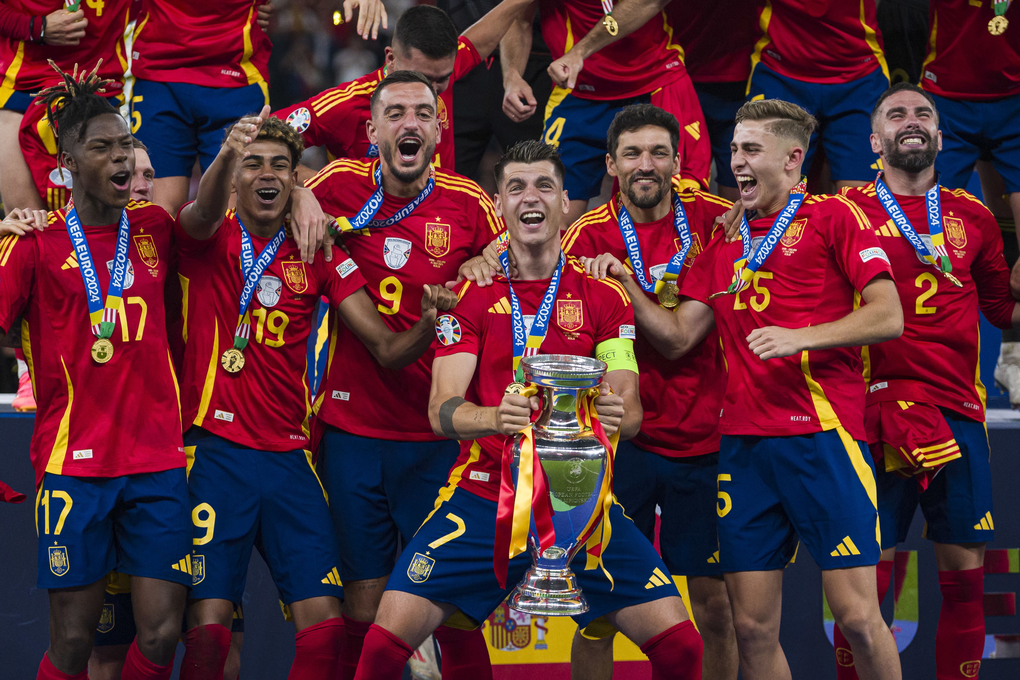Spain's captiain Alvaro Morata and teammates celebrate with the European Championship trophy after beating England in the UEFA Euro 2024 final at Olympiastadion on July 14. (Photo by Marcio Machado/Eurasia Sport Images/Getty Images)