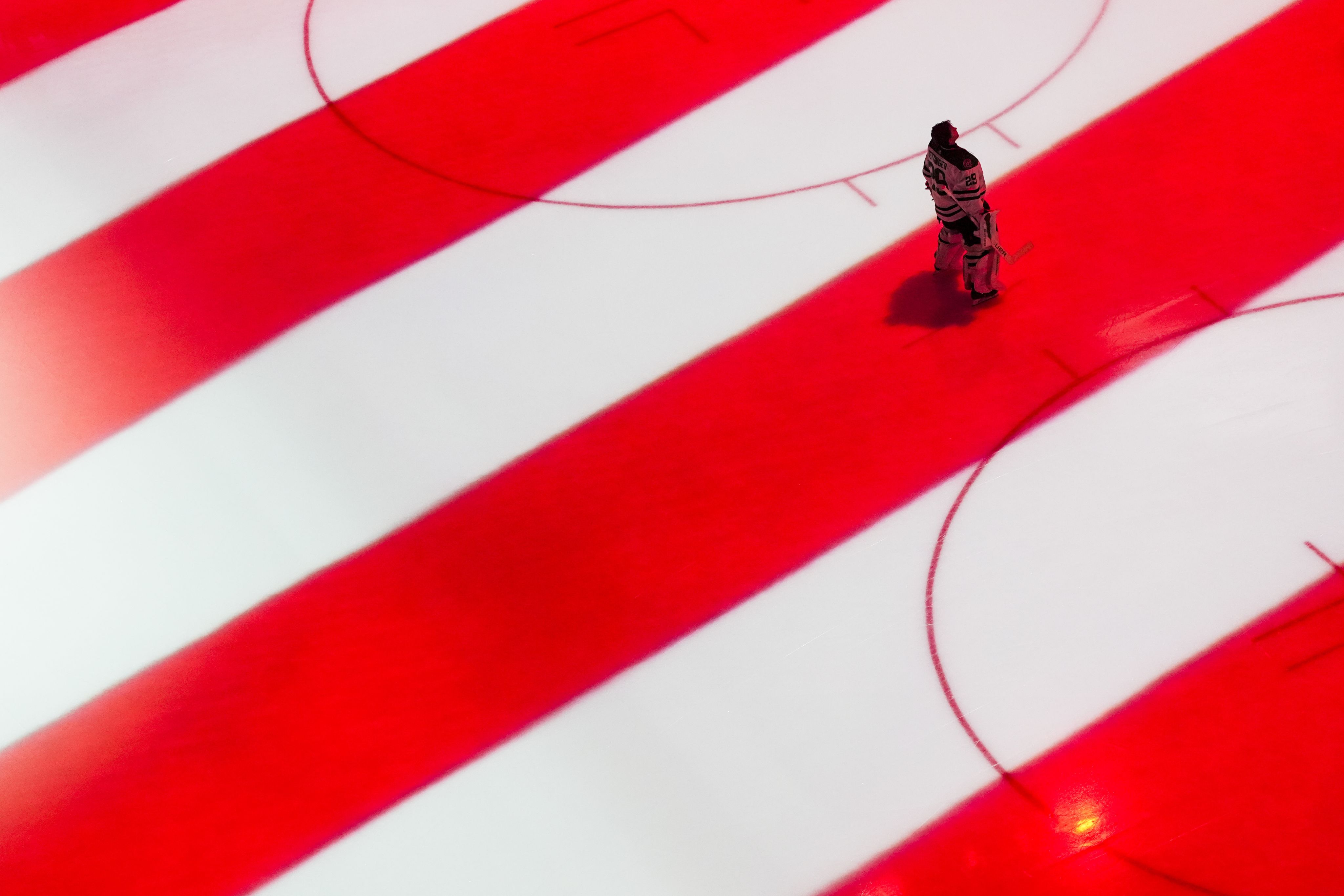 Dallas Stars goaltender Jake Oettinger stands in a projection of the American flag during the national anthem before an NHL hockey game against the Seattle Kraken on March 30. (AP Photo/Lindsey Wasson)