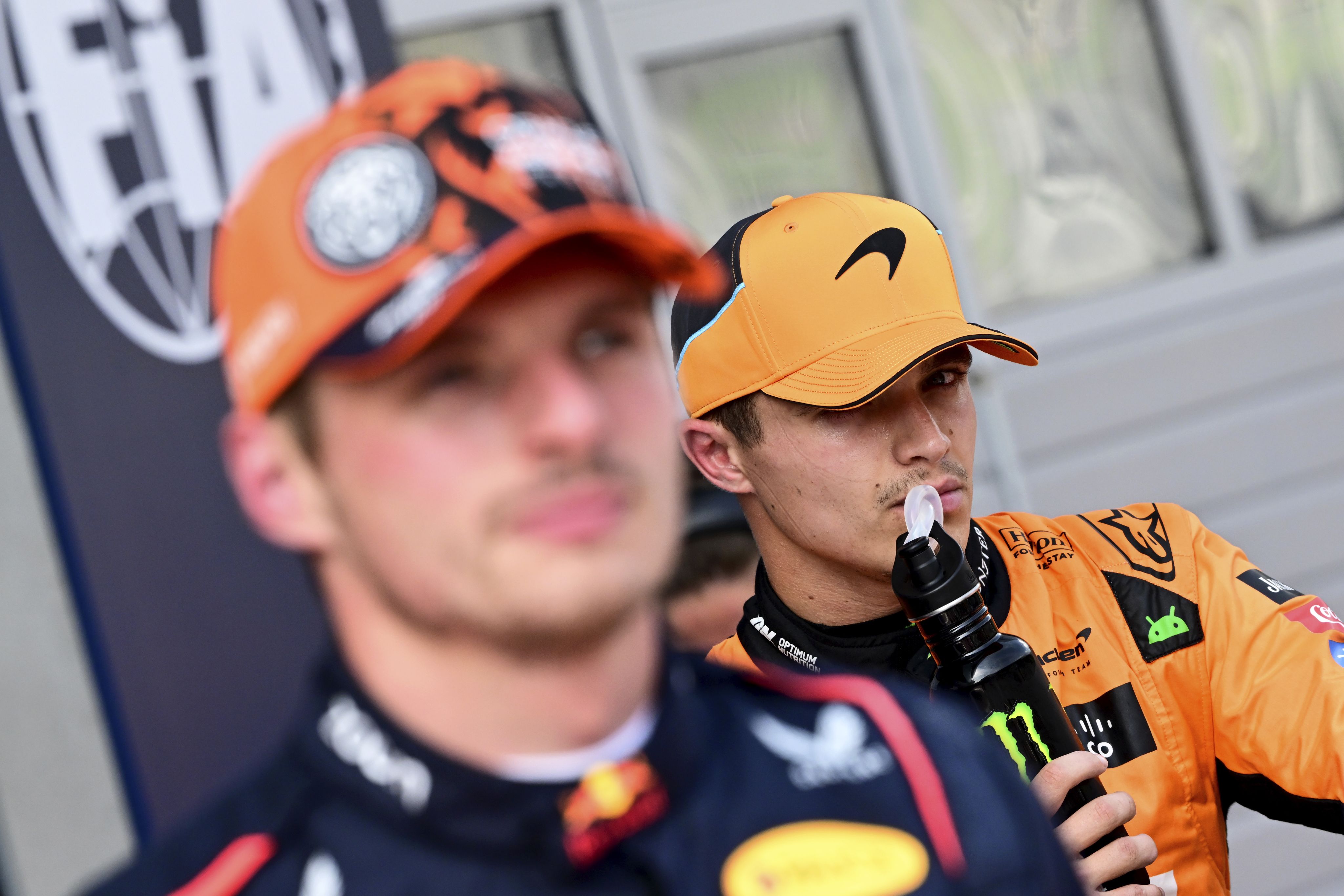 McLaren's Lando Norris looks at Red Bull's Max Verstappen after qualifying for the Austrian Formula One Grand Prix at the Red Bull Ring racetrack in Spielberg, southern Austria on June 29. (AP Photo/Christian Bruna)