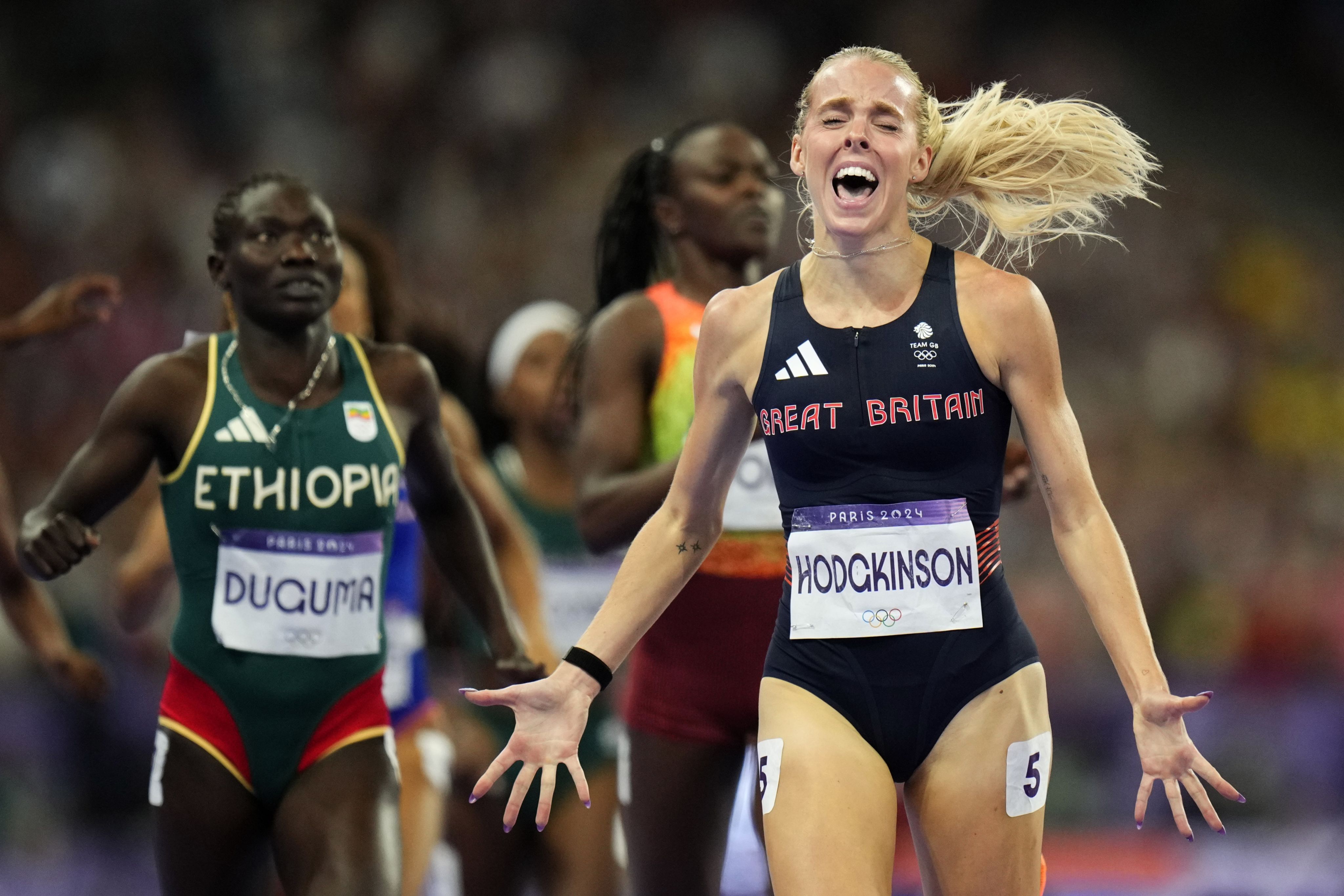 Keely Hodgkinson of Great Britain celebrates as she wins the women's 800-metres final at the 2024 Paris Olympics on Aug 5. (AP Photo/Petr David Josek)