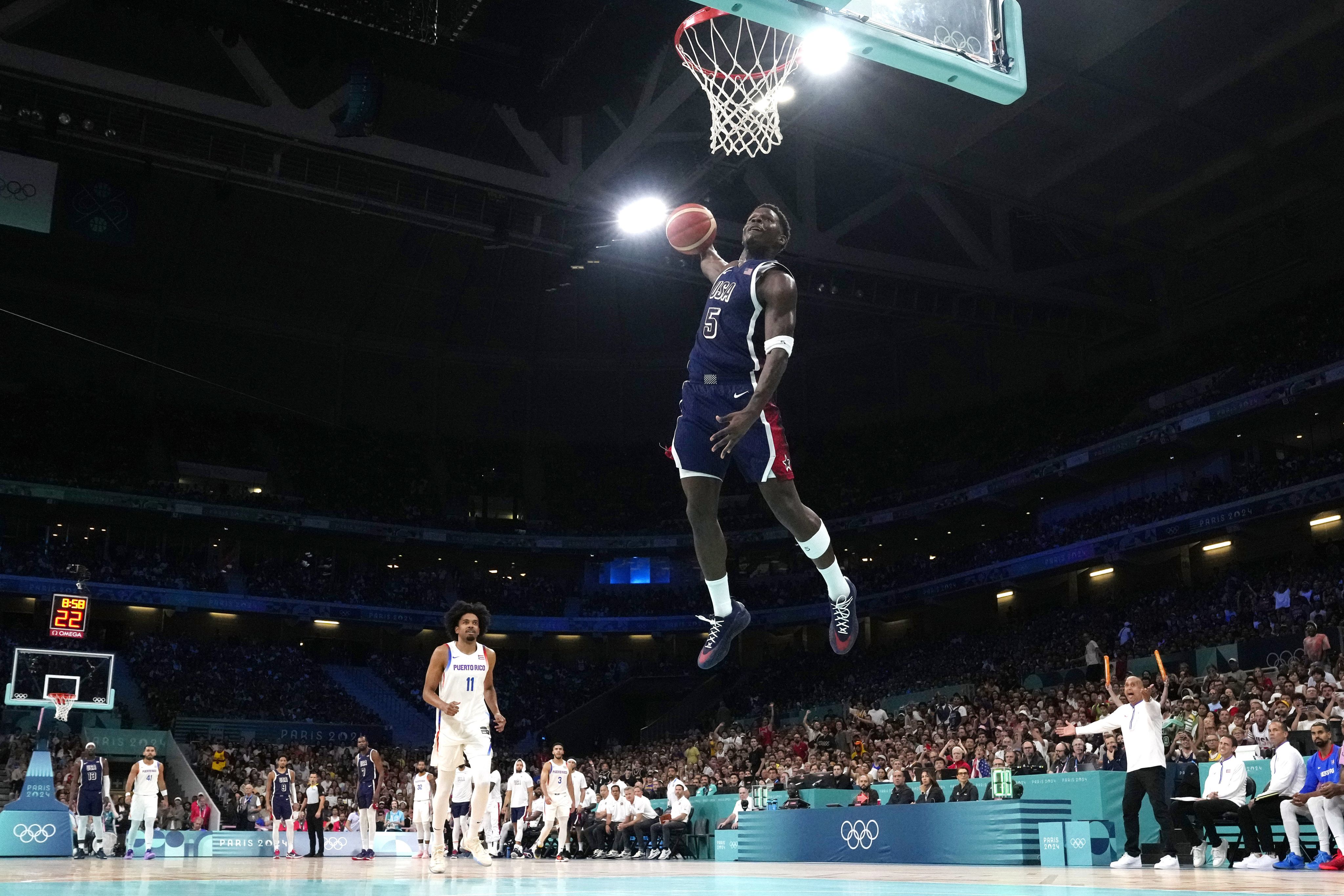 Team USA's Anthony Edwards is pictured mid-dunk as Puerto Rico's Stevie Thompson Jr. watches on during a men's basketball game at the 2024 Paris Olympics on Aug 3. (AP Photo/Michael Conroy)