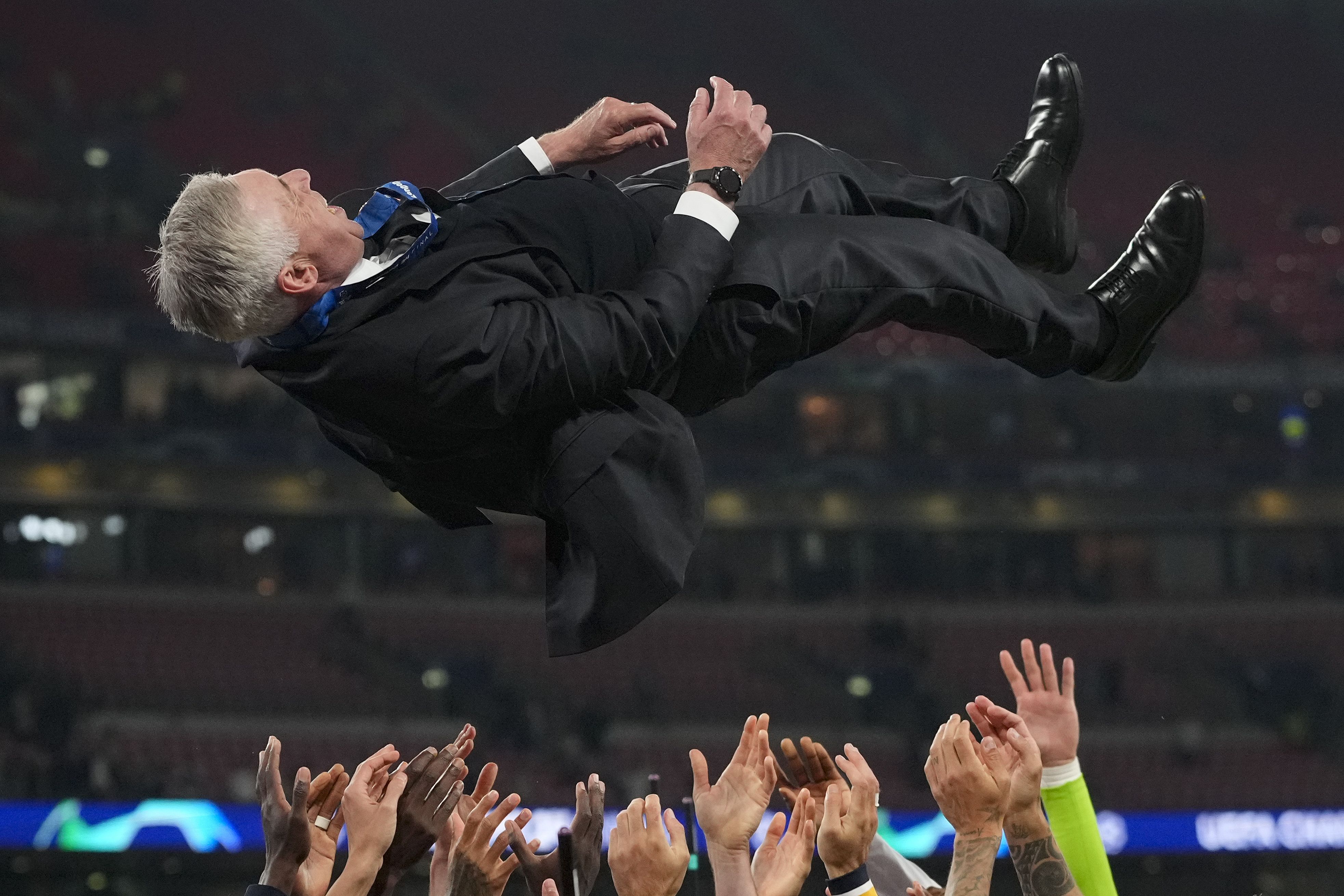 Players throw Real Madrid head coach Carlo Ancelotti in the air after winning the Champions League final against Borussia Dortmund at Wembley Stadium in London on June 1. (AP Photo/Kirsty Wigglesworth)