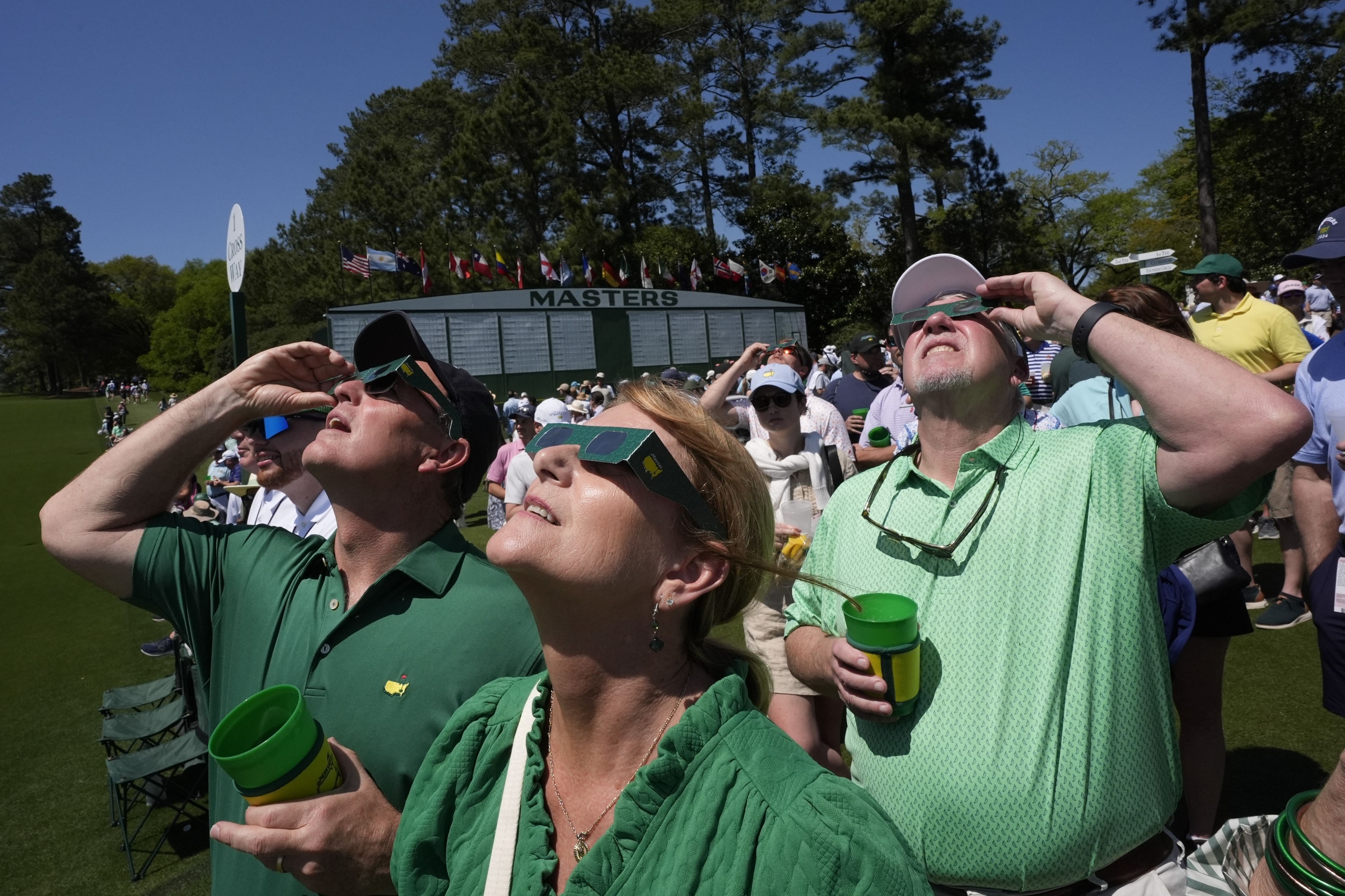 Patrons watch a solar eclipse during a practice round in preparation for the Masters golf tournament at Augusta National Golf Club on April 8. (AP Photo/George Walker IV)