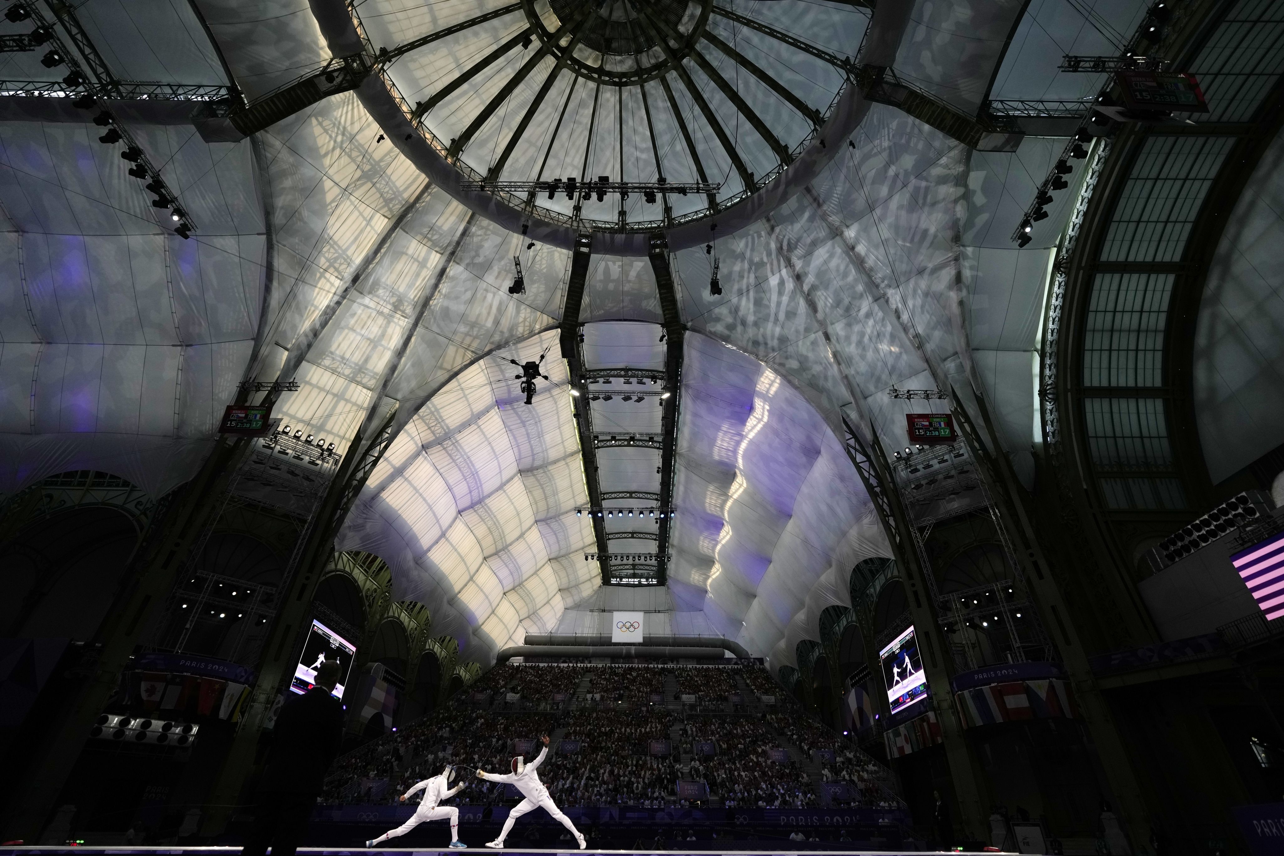 Czech Republic's Jiri Beran (left) competes with France's Yannik Borel in the men's team epee bronze final match at the Grand Palais during the 2024 Paris Olympics on Aug 2. (AP Photo/Abbie Parr)