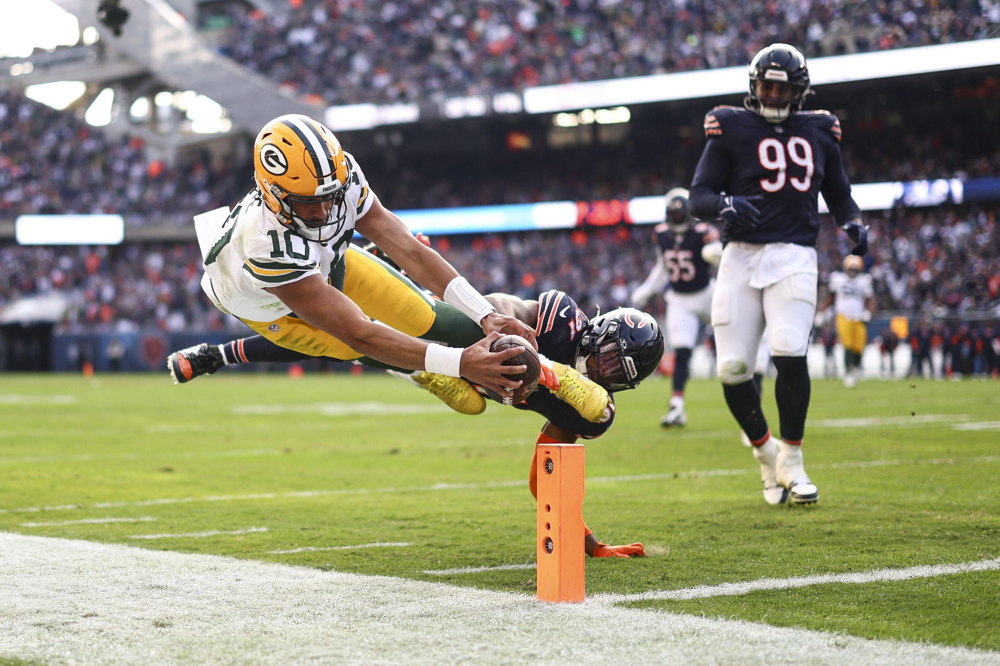 Jordan Love of the Green Bay Packers dives at the pylon with the ball during the second half of an NFL game against the Chicago Bears at Soldier Field on Nov 17. (Photo by Kevin Sabitus/Getty Images)