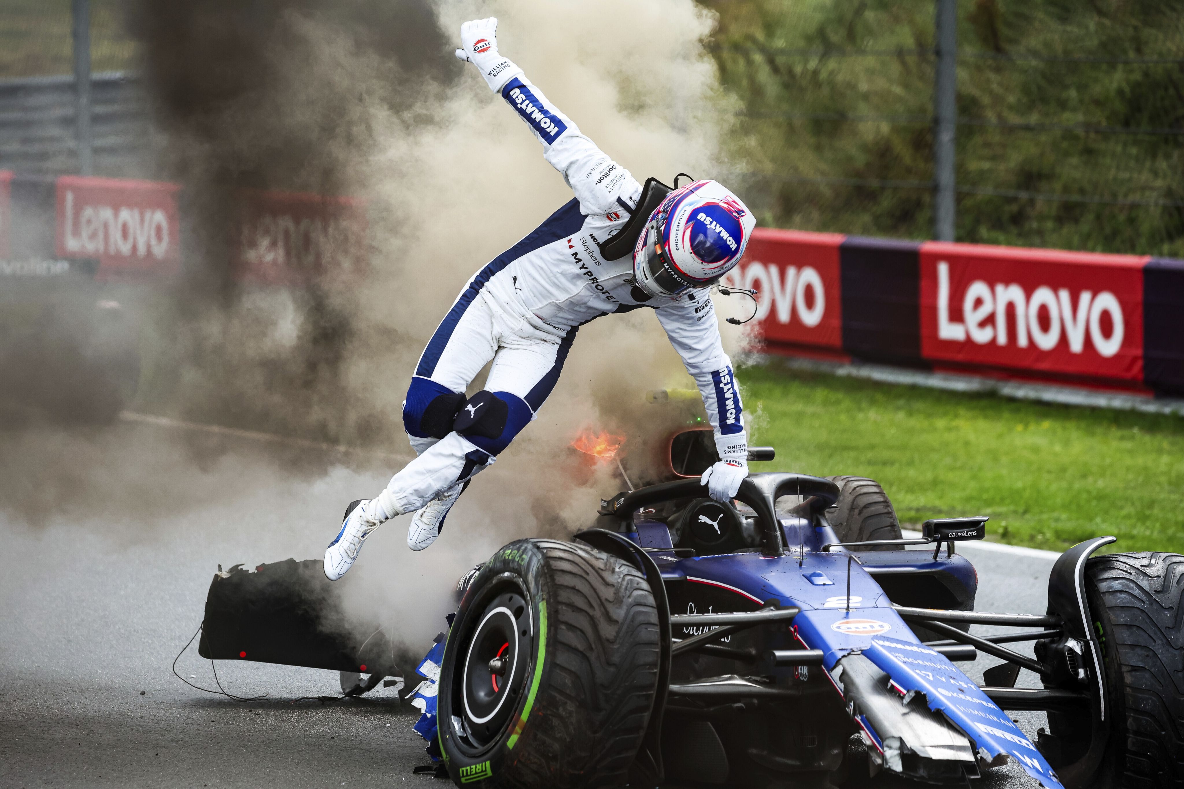 Logan Sargeant of Williams Racing leaps from his fire-damaged car during the Dutch Grand Prix on Aug 24. (Photo by: HOCH ZWEI/picture-alliance/dpa/AP Images)