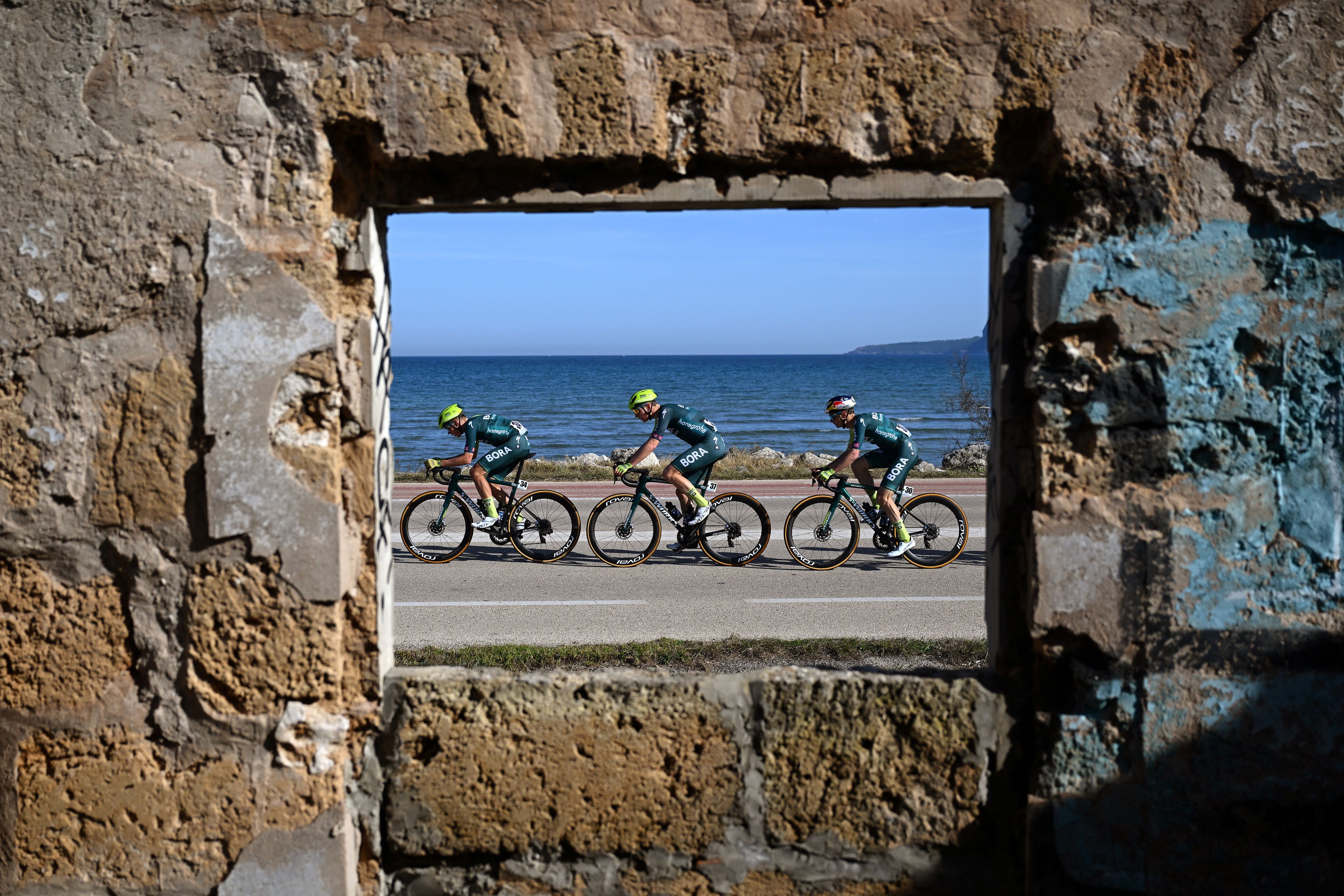 Luis-Joe Luhrs, Emil Herzog and Anton Palzer of team Red Bull–Bora–Hansgrohe ride through Andratx while competing in the Challenge Ciclista Mallorca 2024 on Jan 27. (Photo by Dario Belingheri/Getty Images)