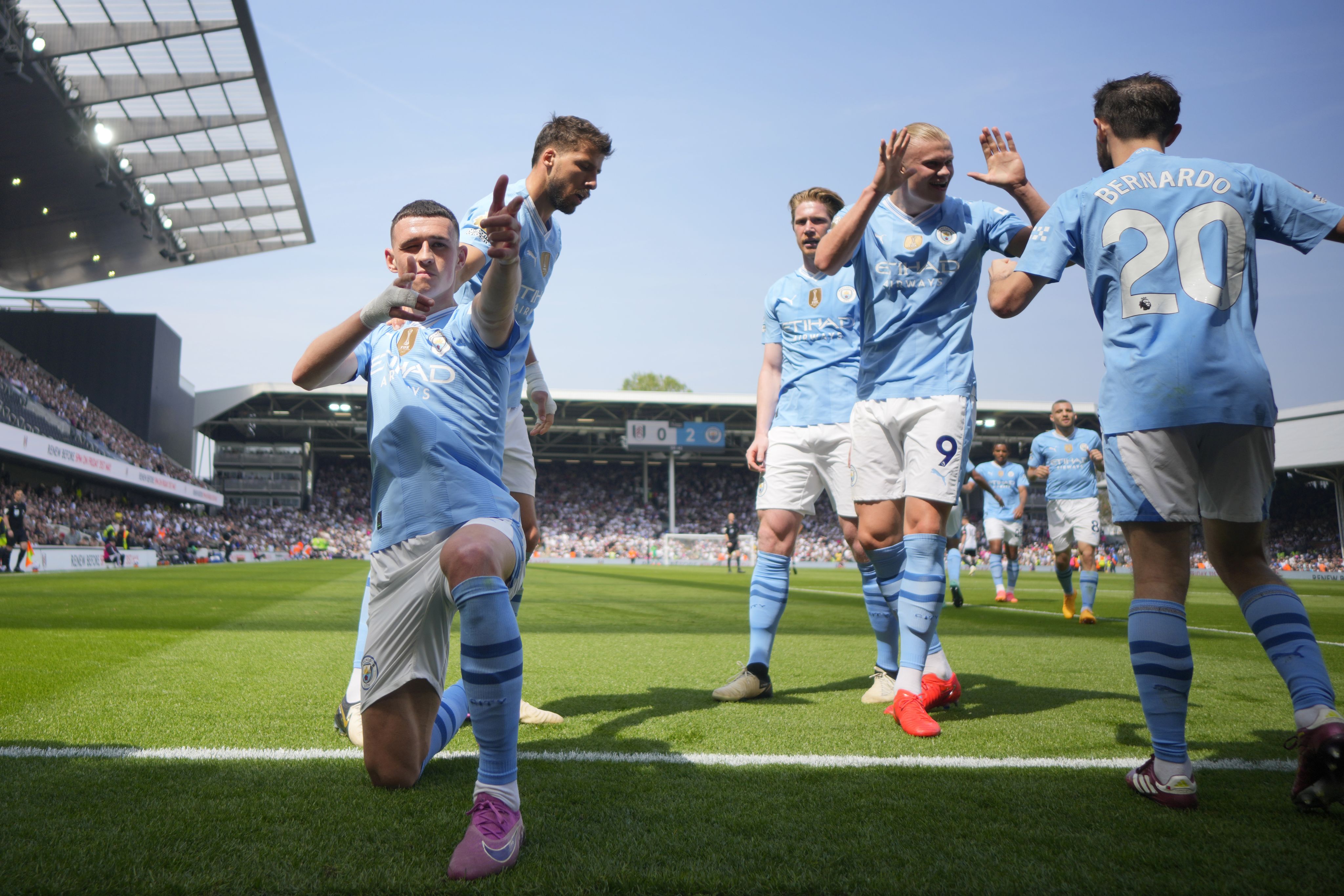 Phil Foden celebrates with teammates after scoring his side's second goal during the Premier League match between Fulham and Manchester City at Craven Cottage on May 11. (AP Photo/Kirsty Wigglesworth)
