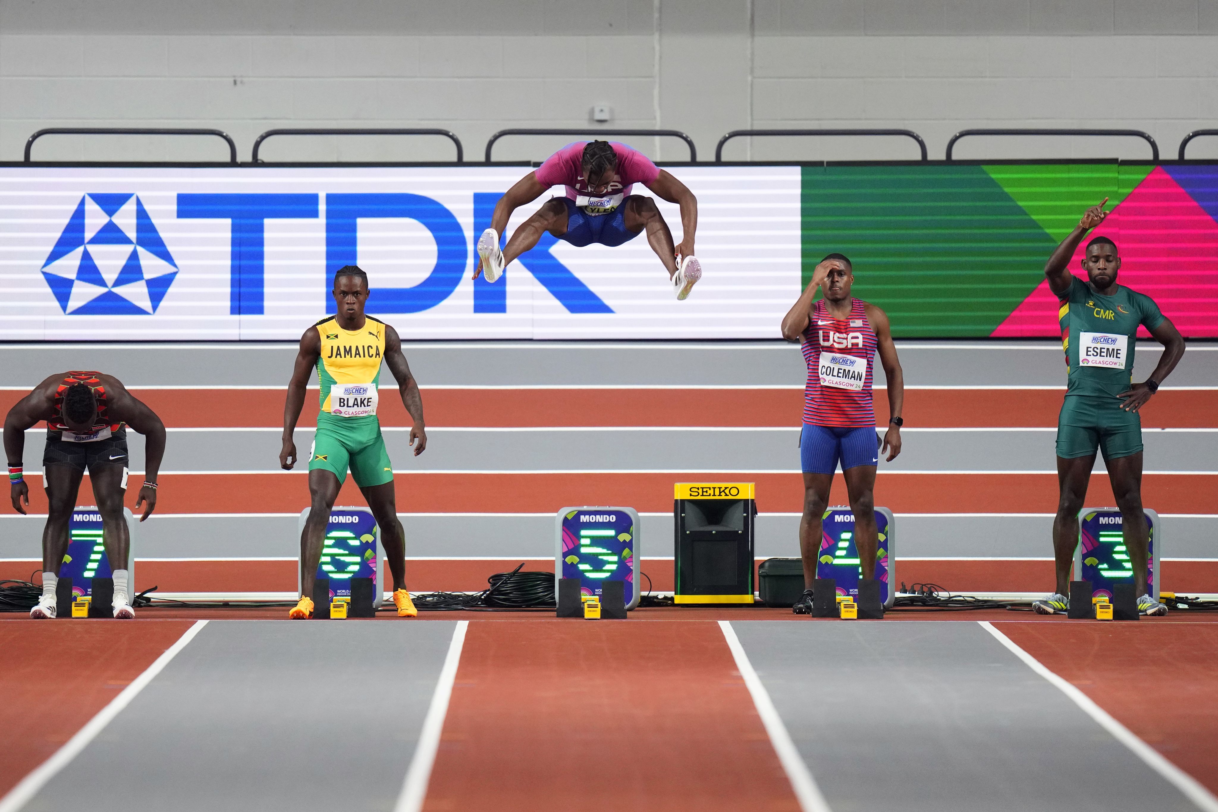 Noah Lyles of the USA gets ready to start in the men's 60 metres final during the World Athletics Indoor Championships at the Emirates Arena in Glasgow on March 1. (AP Photo/Petr David Josek)