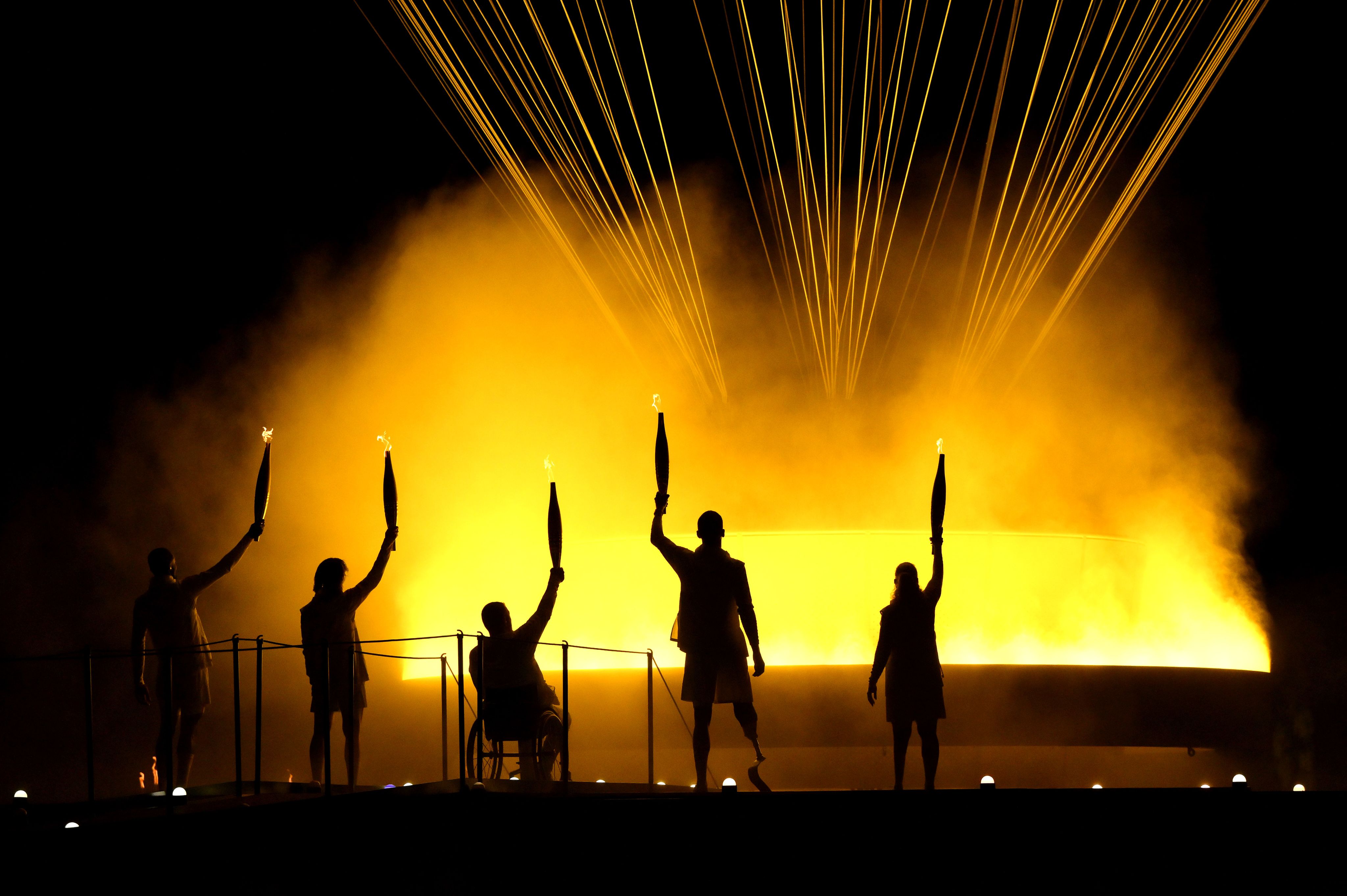 Torchbearers Charles Antoine Kouakou, Fabien Lamirault, Elodie Lorandi, Nantenin Keita and Alexis Hanquinquant gesture after lighting the Cauldron to conclude the opening ceremony of the Paris 2024 Paralympic Games on Aug 28. (Photo by David Ramos/Getty Images)