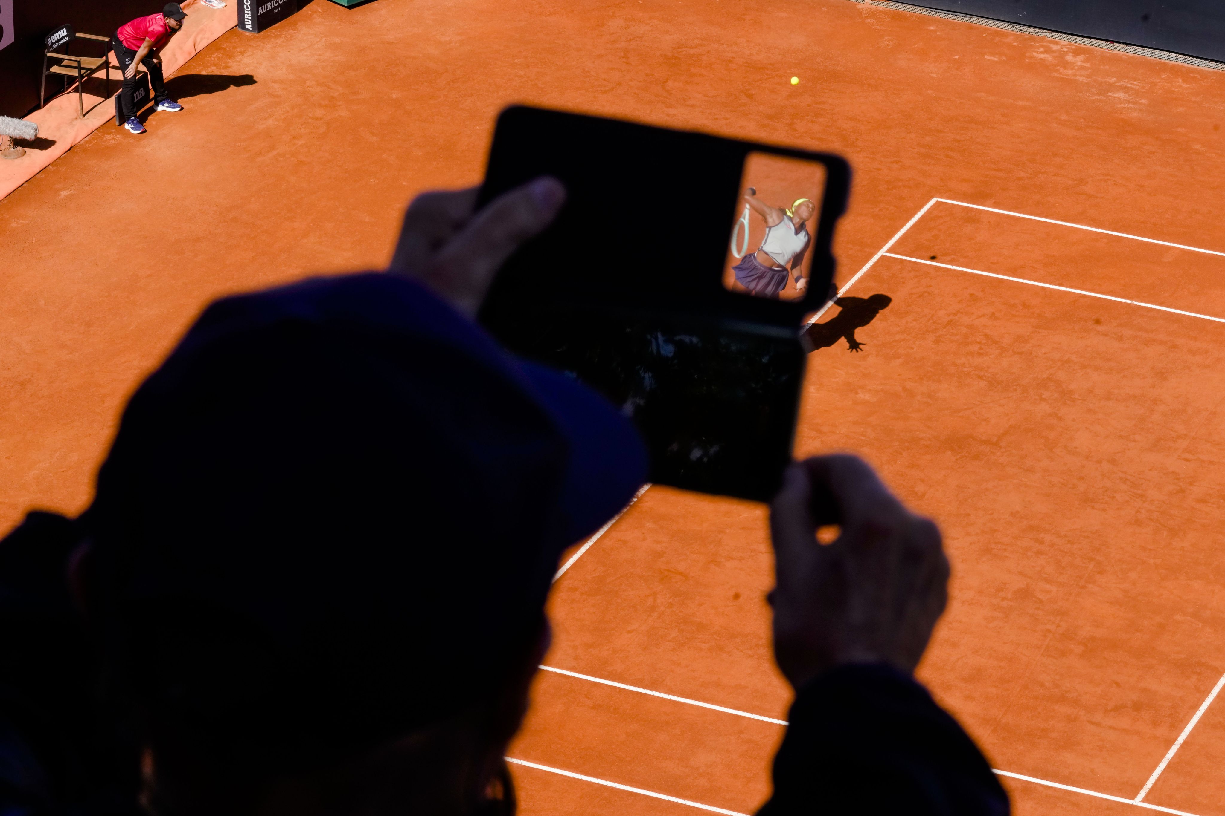 Coco Gauff of the United States is viewed through a spectator's smartphone case while serving in her match against Poland's Iga Swiatek at the Italian Open on May 16. (AP Photo/Andrew Medichini)