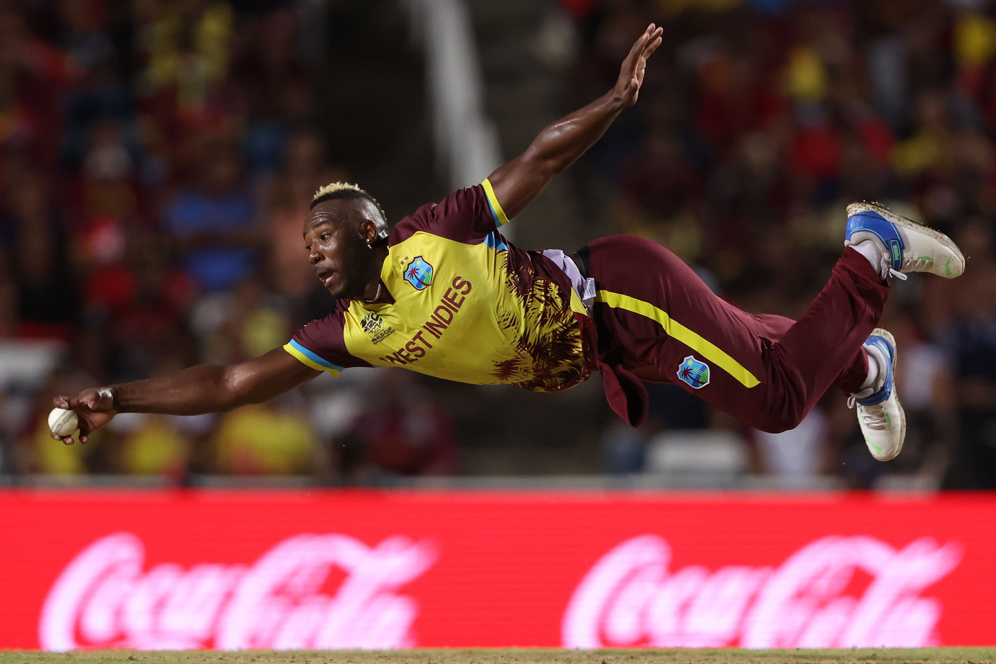 Andre Russell fields off his own delivery during the ICC Men's T20 Cricket World Cup match between West Indies and New Zealand on June 12. (Photo by Darrian Traynor-ICC/ICC via Getty Images)