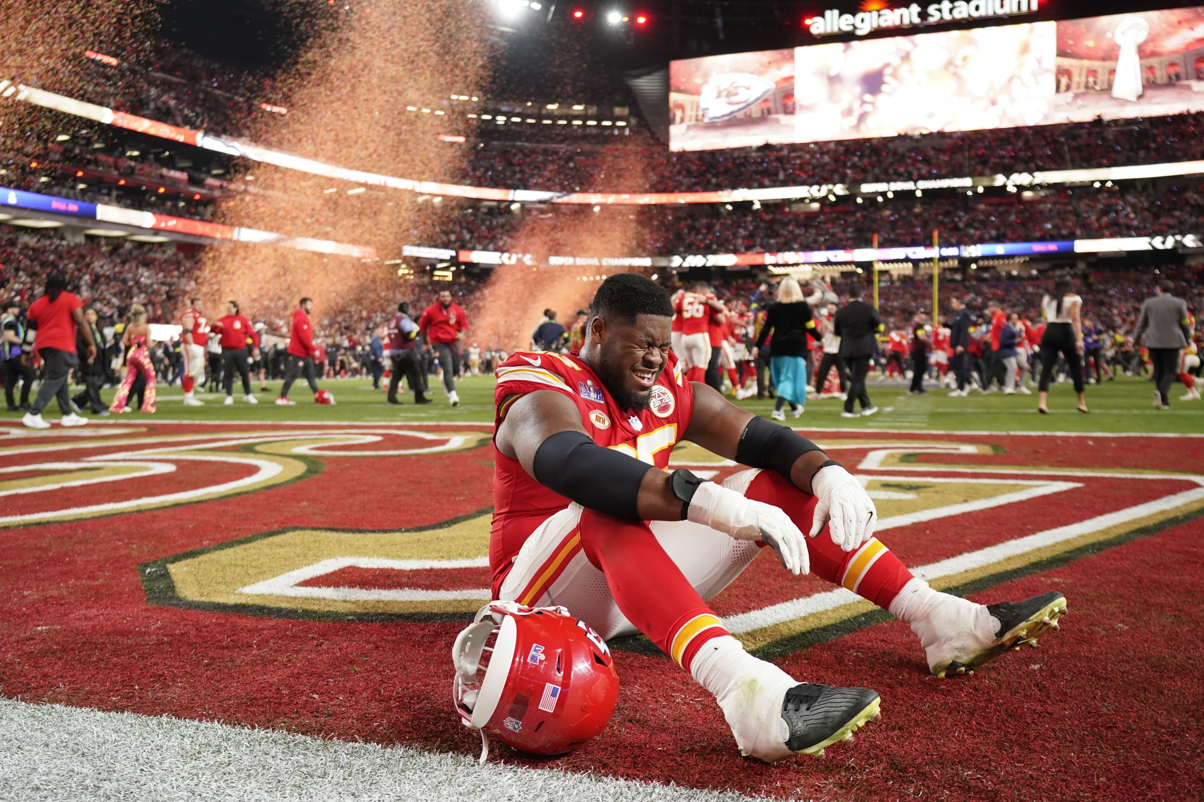 Kansas City Chiefs guard Trey Smith is overcome with emotion after winning Super Bowl LVIII against the San Francisco 49ers. The Chiefs won 25-22 at the Allegiant Stadium in Las Vegas on Feb 11. (AP Photo/Eric Gay)