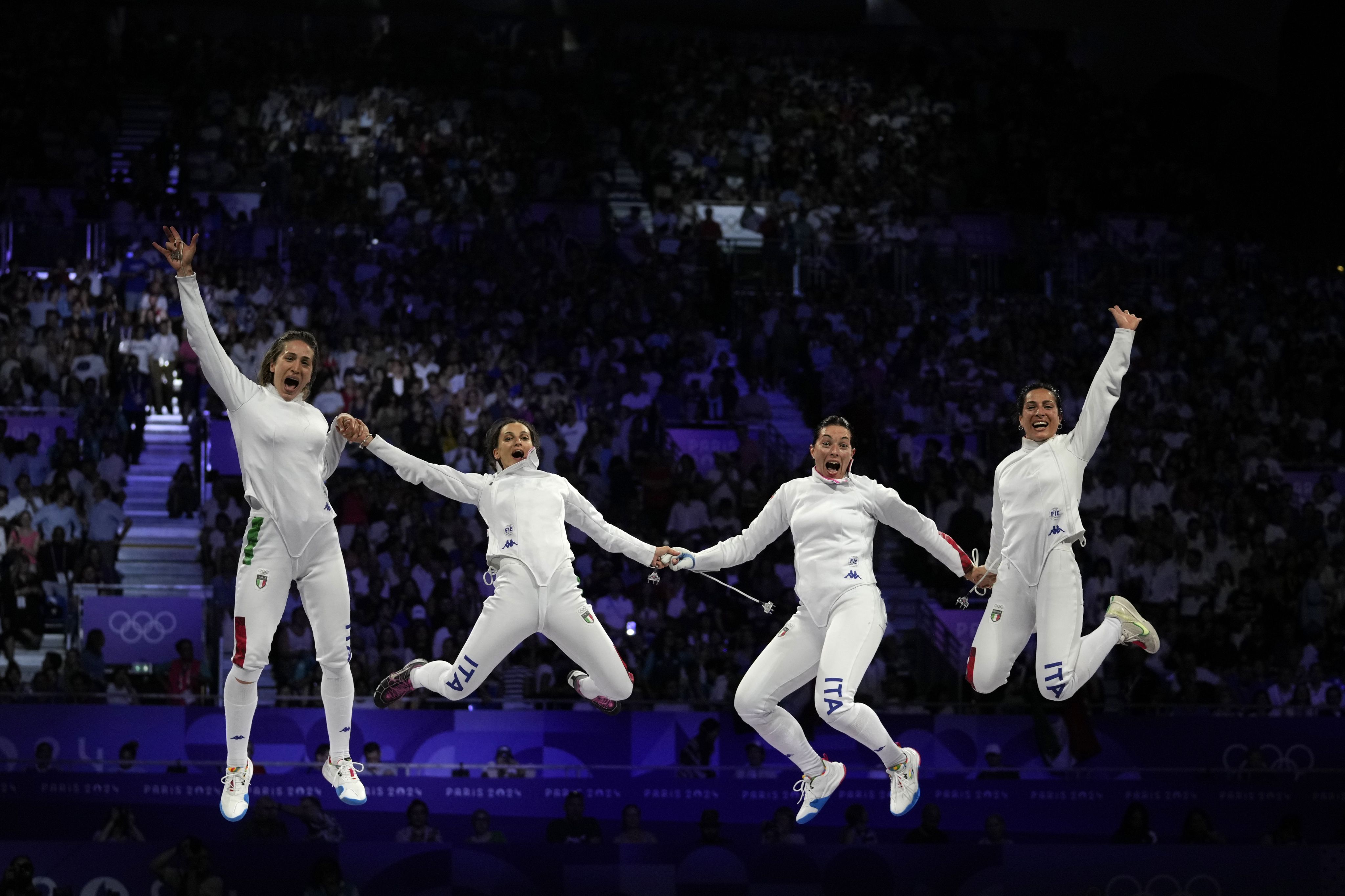 Italy's Giulia Rizzi, Rossella Fiamingo, Alberta Santuccio and Mara Navarria celebrate after winning the women's team Epee final against France during the 2024 Paris Olympics on July 30. (AP Photo/Andrew Medichini)